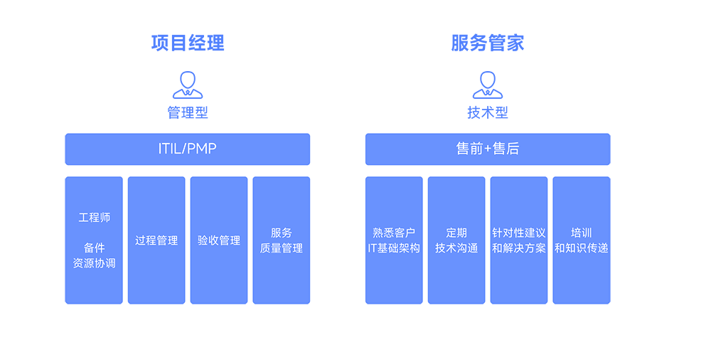 配備成熟的項(xiàng)目經(jīng)理和技術(shù)服務(wù)管家,面向用戶統(tǒng)一接口、